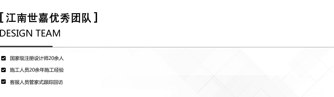 “江南世嘉”屬于江南世嘉裝飾公司獨有品牌,所有基礎(chǔ)工程施工人員均為公司工作人員,工程絕不轉(zhuǎn)包分包,如有發(fā)現(xiàn)賠付全額工程款,歡迎監(jiān)督。